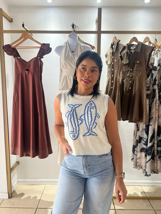 Cream Blue Fish Print Sweater Top
