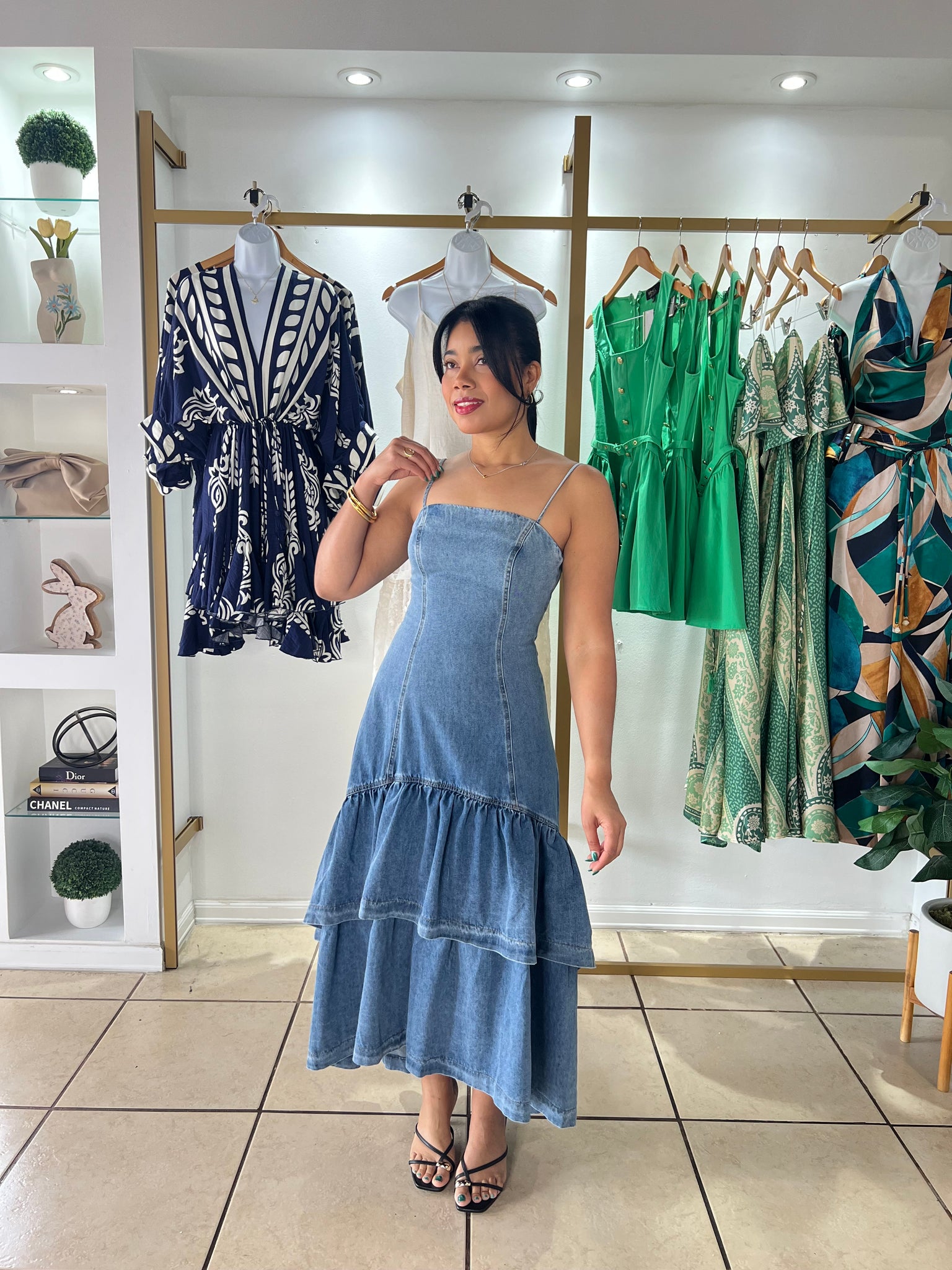 A washed denim midi dress featuring straight neckline, straps, double layer hi-lo and back zipper closure