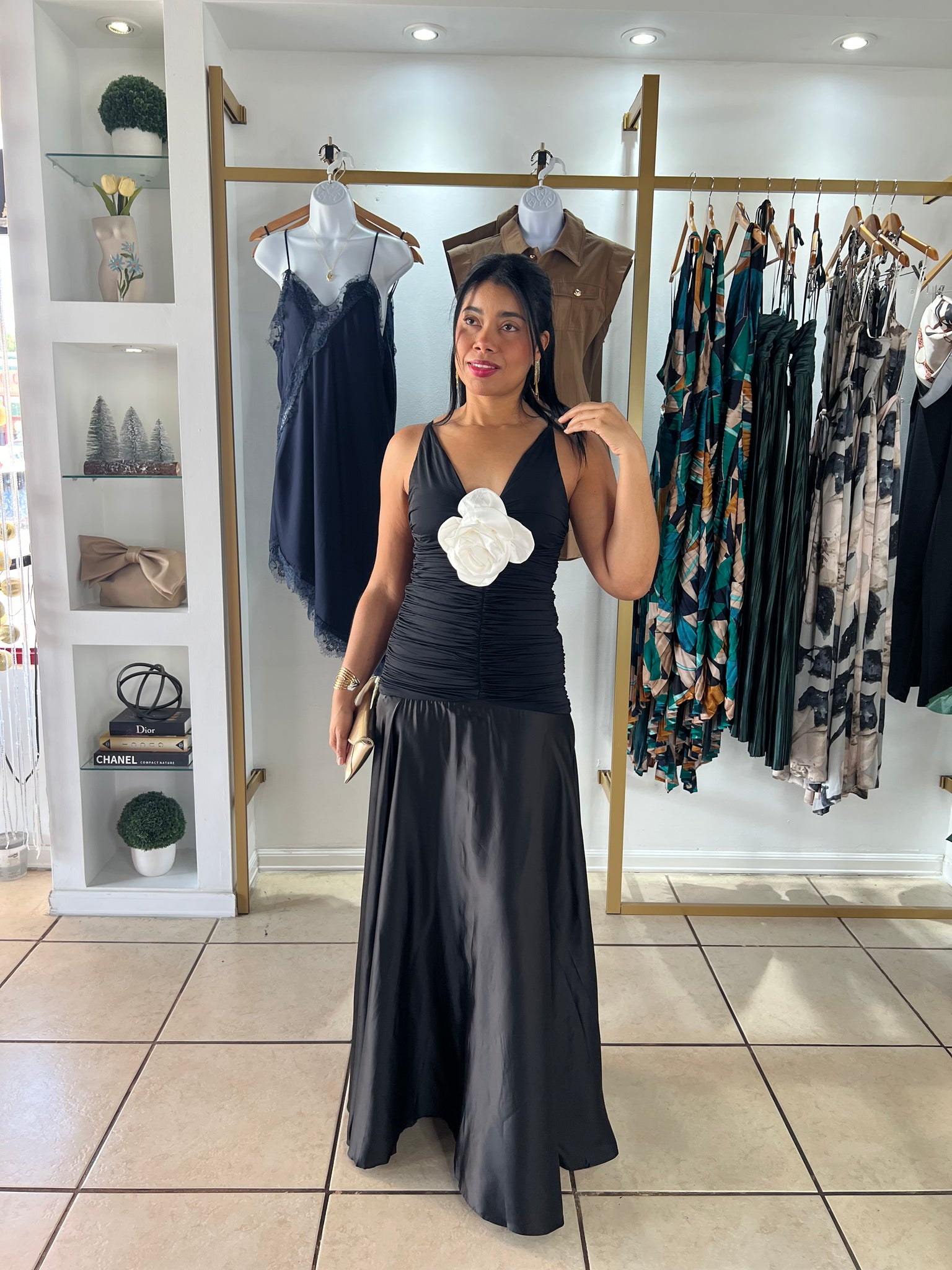Floral detail jersey satin mix gown dress, back zipper adjustable straps