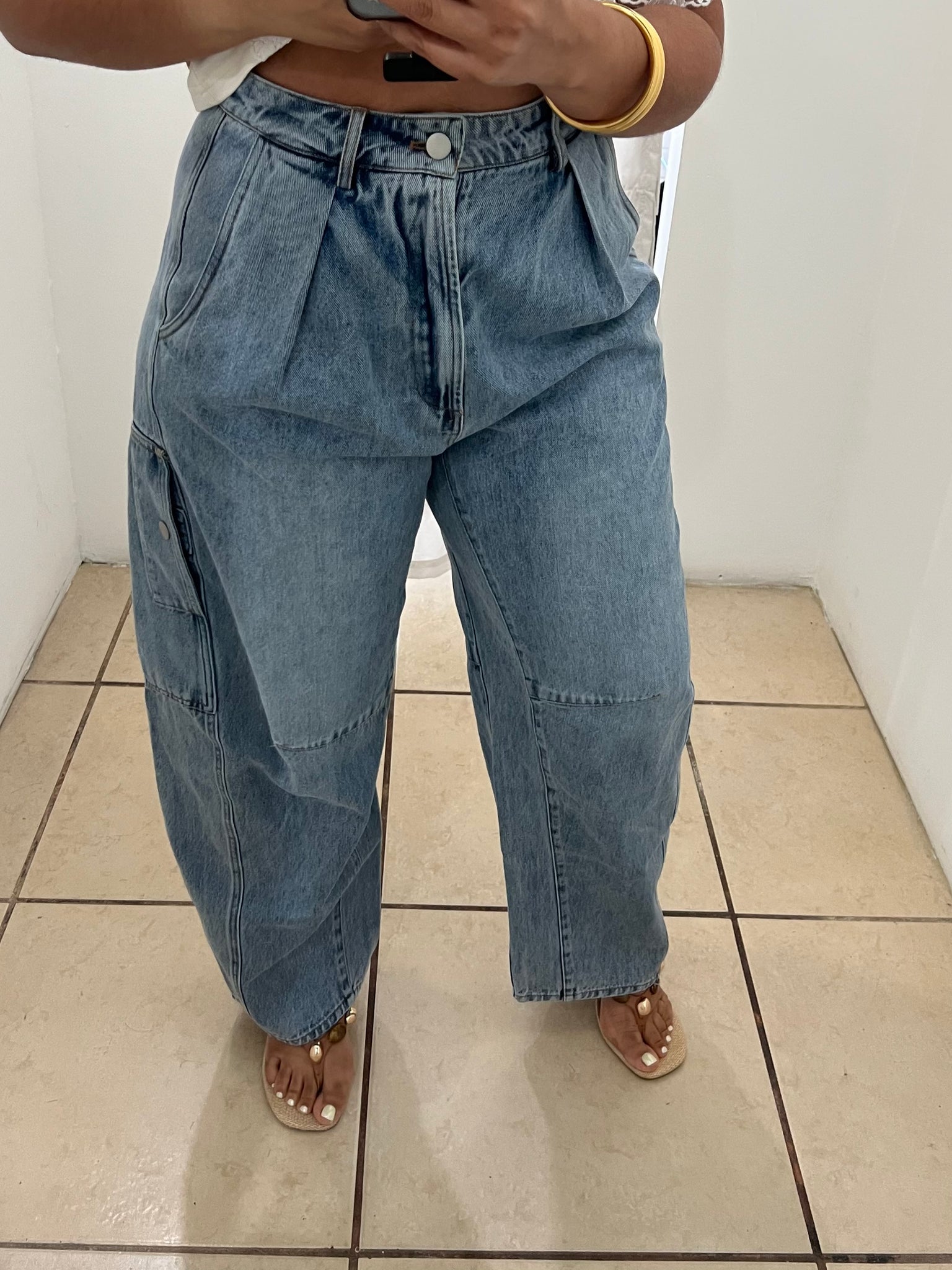 A washed denim pant with front closure and side pockets.