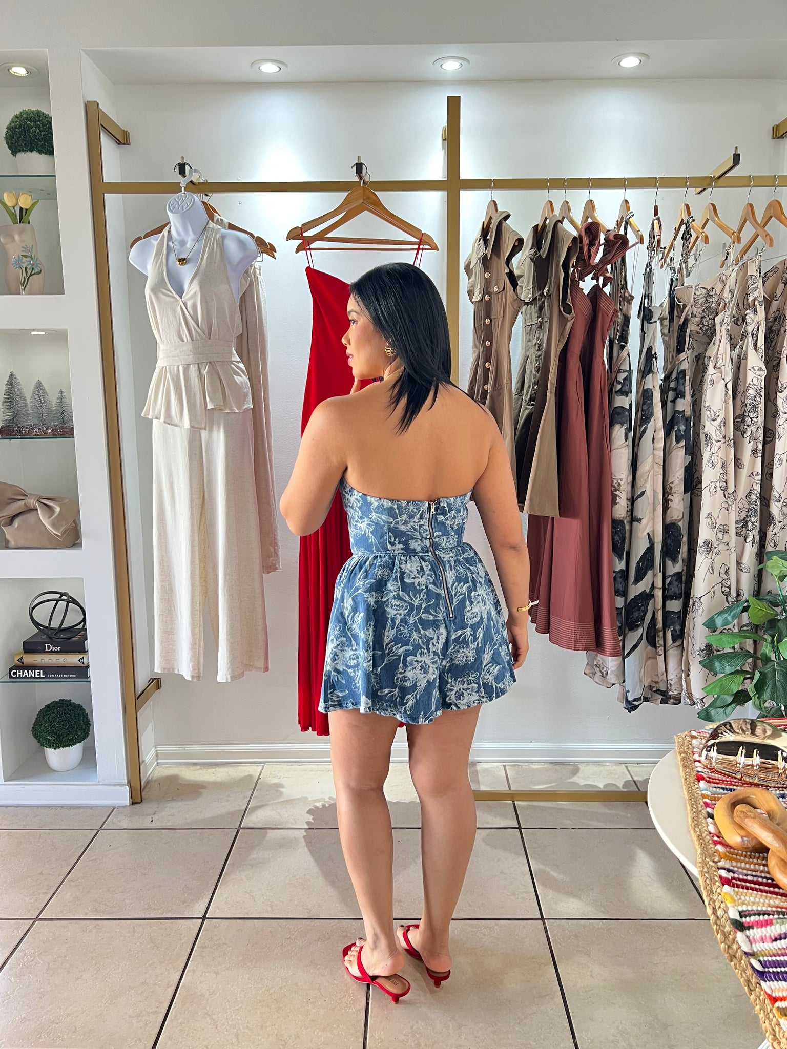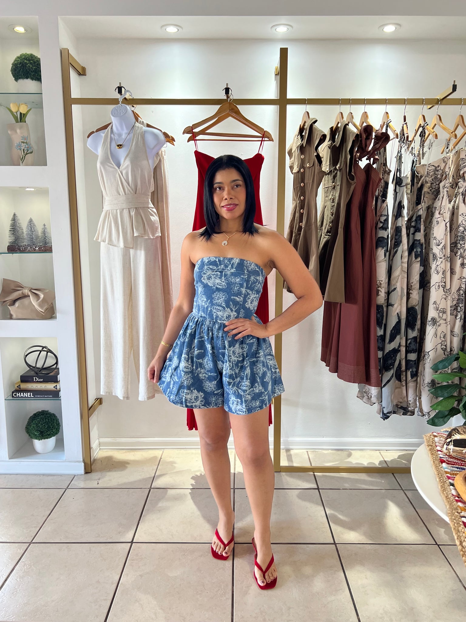 Denim flower print tube romper, back zipper