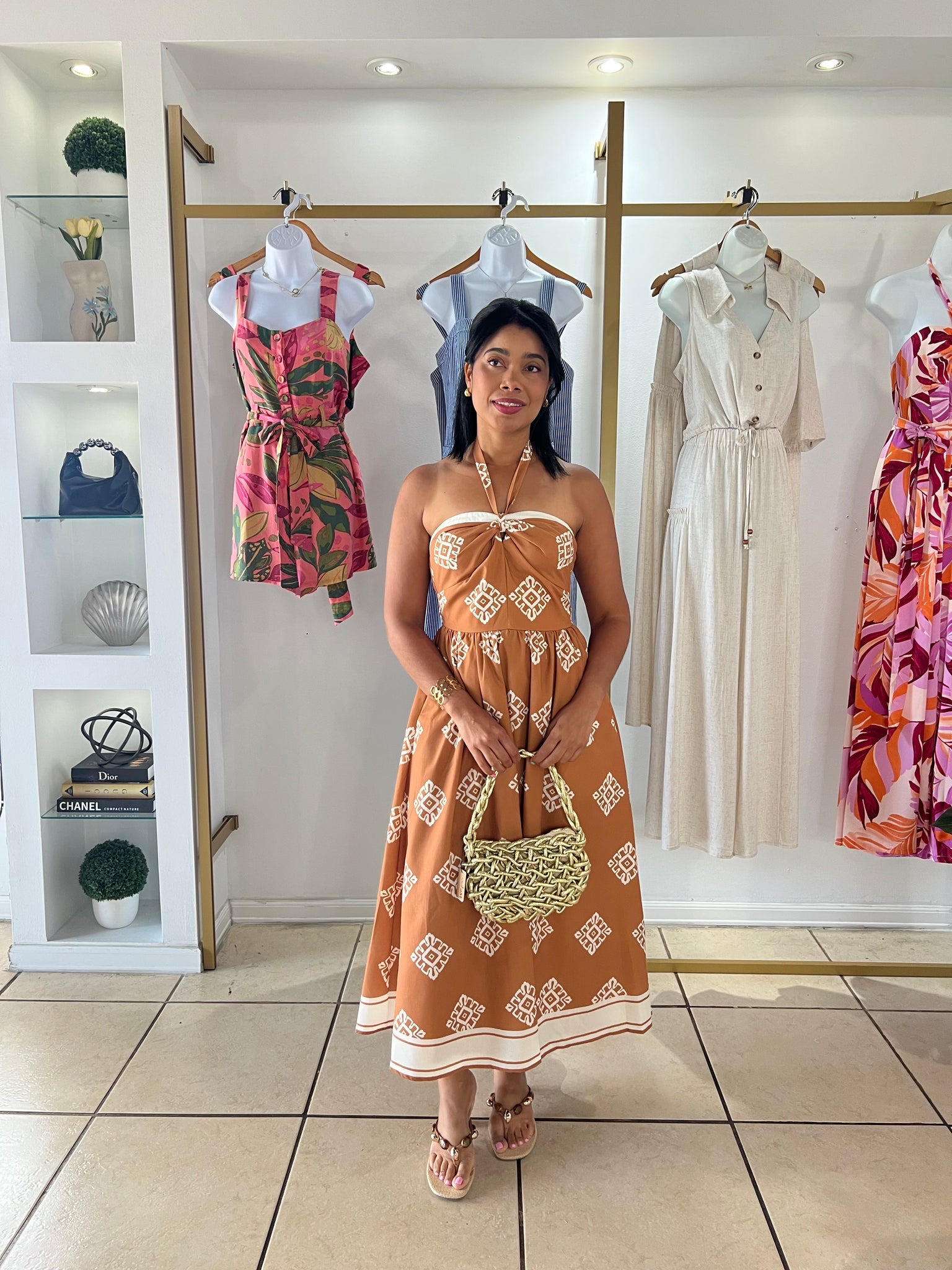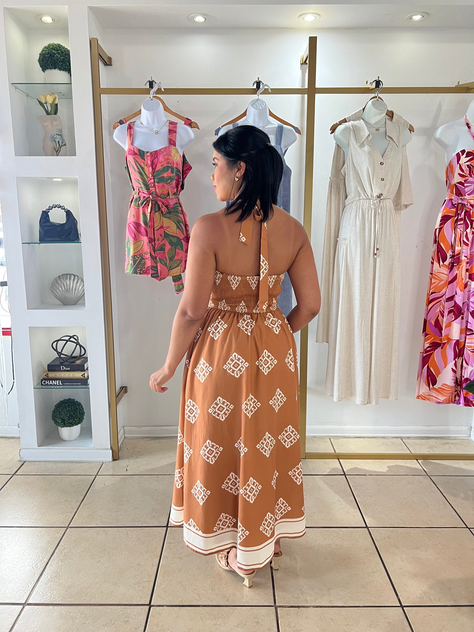 A printed woven midi dress featuring halter neckline with back neck tie, full skirt and smocked back bodice