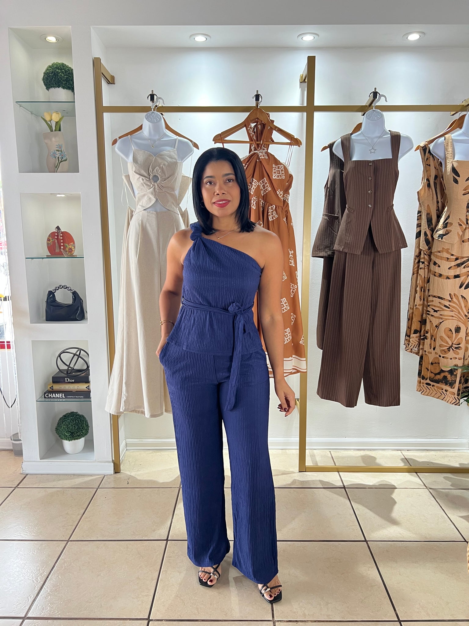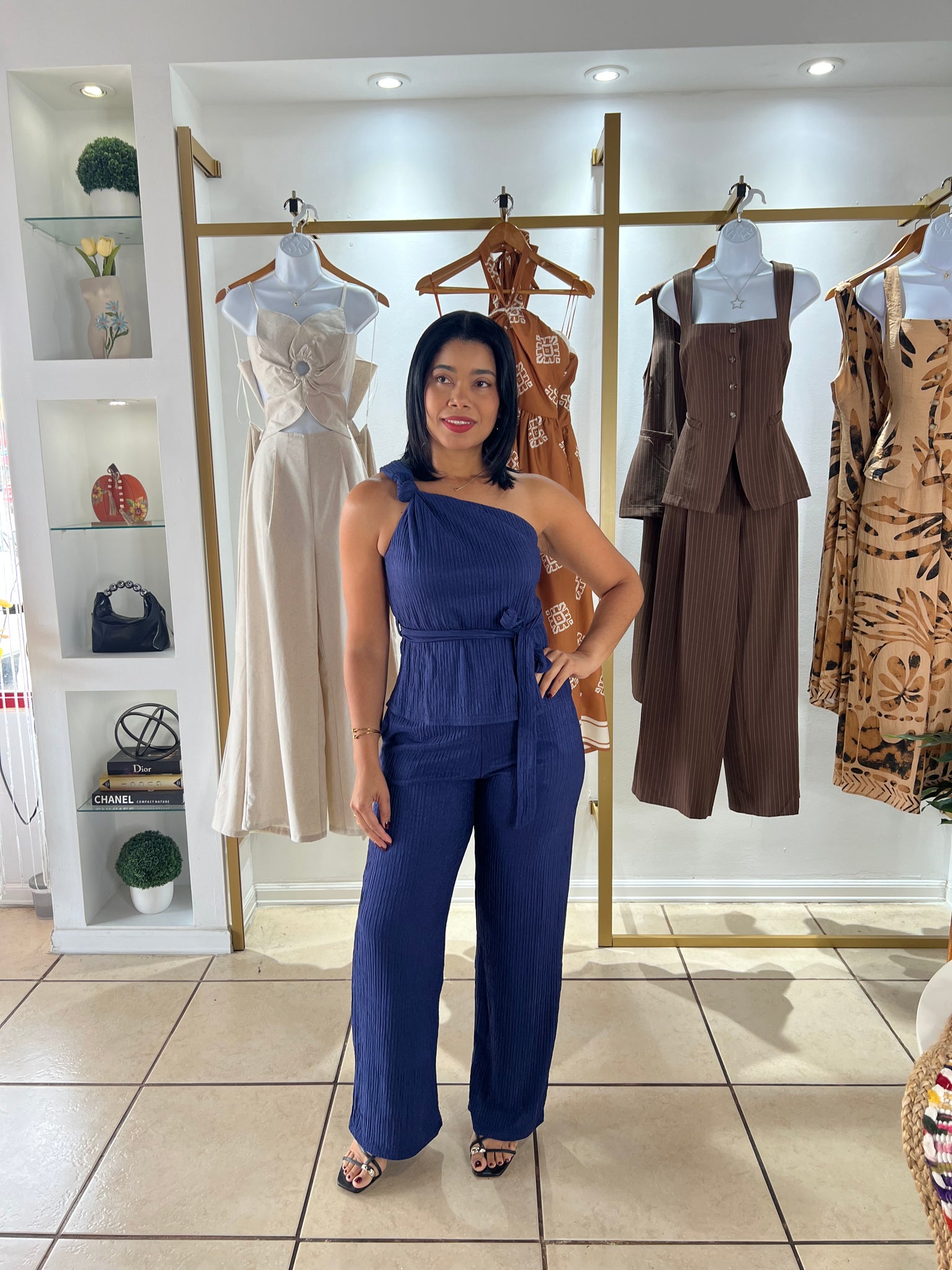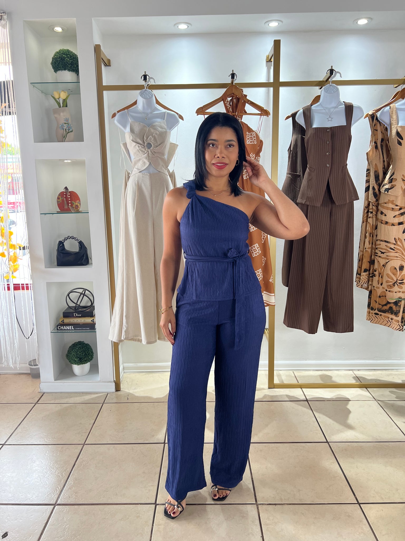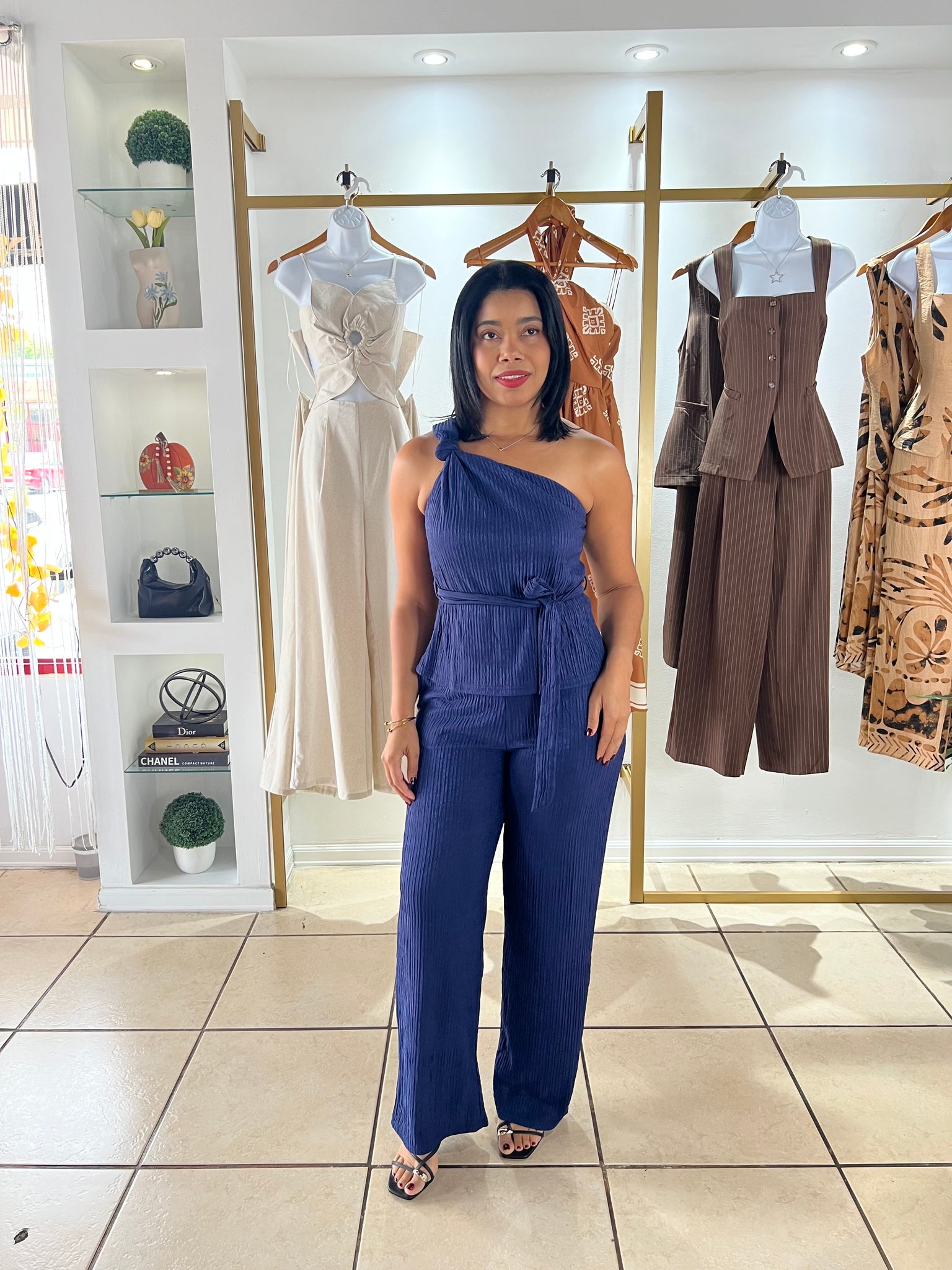 Navy Knotted one shoulder plisse knit top with pant (set)