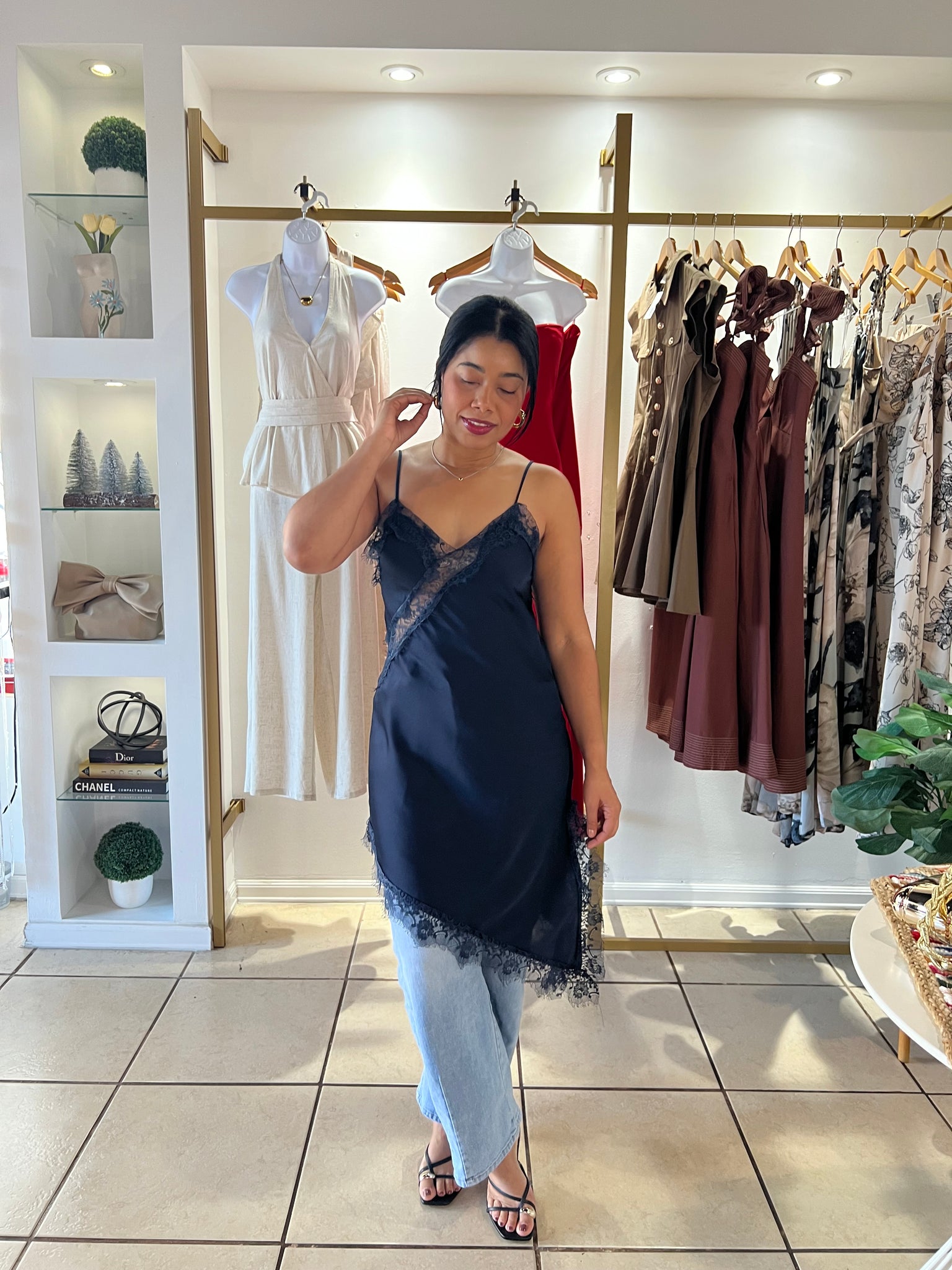 Navy satin tunic asymmetric tunic dress, elastic back, lace insert