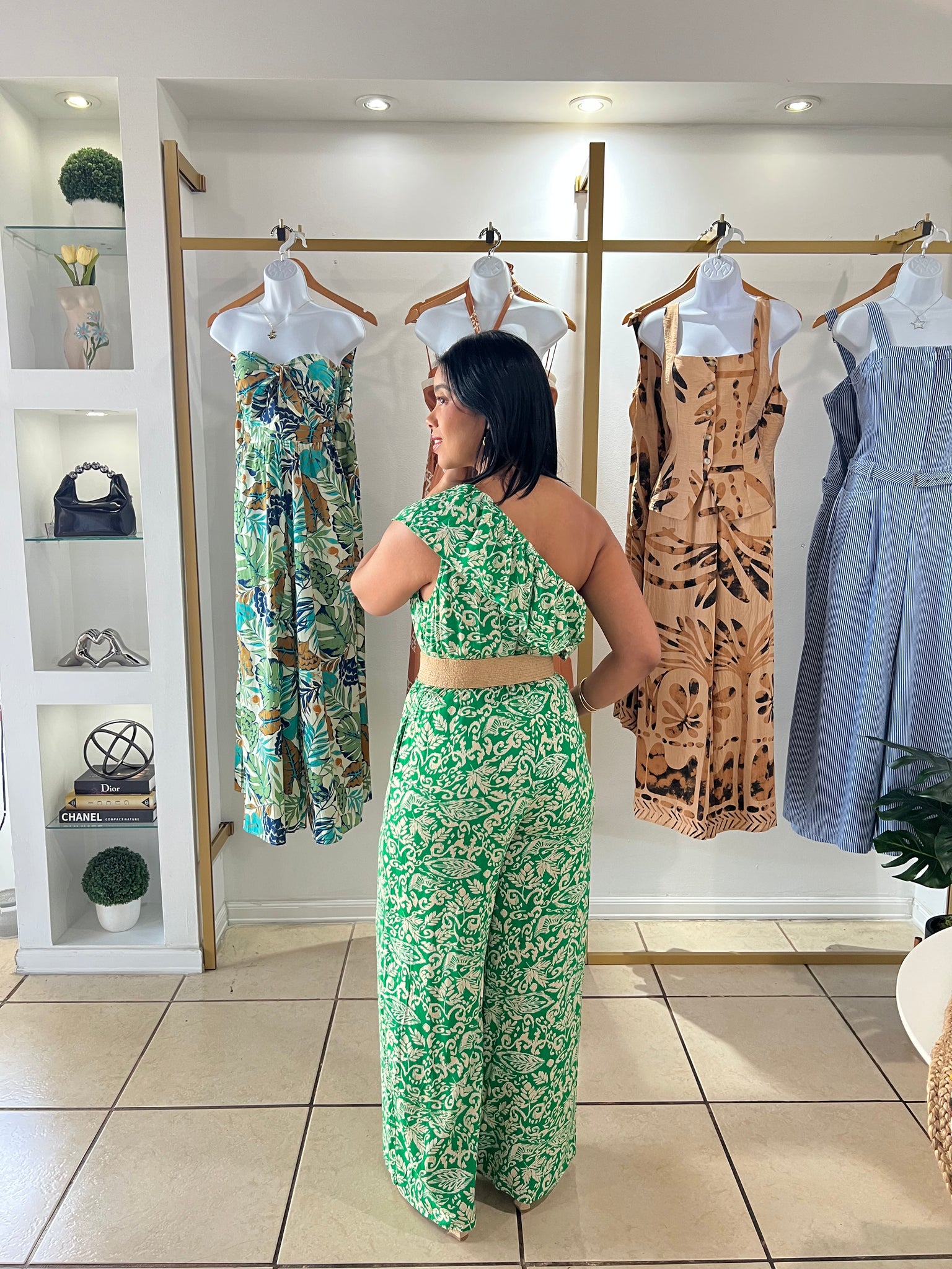 SLEEVELESS RUFFLE ASYMMETRIC WOVEN PRINT JUMPSUIT WITH SIDE POCKET
