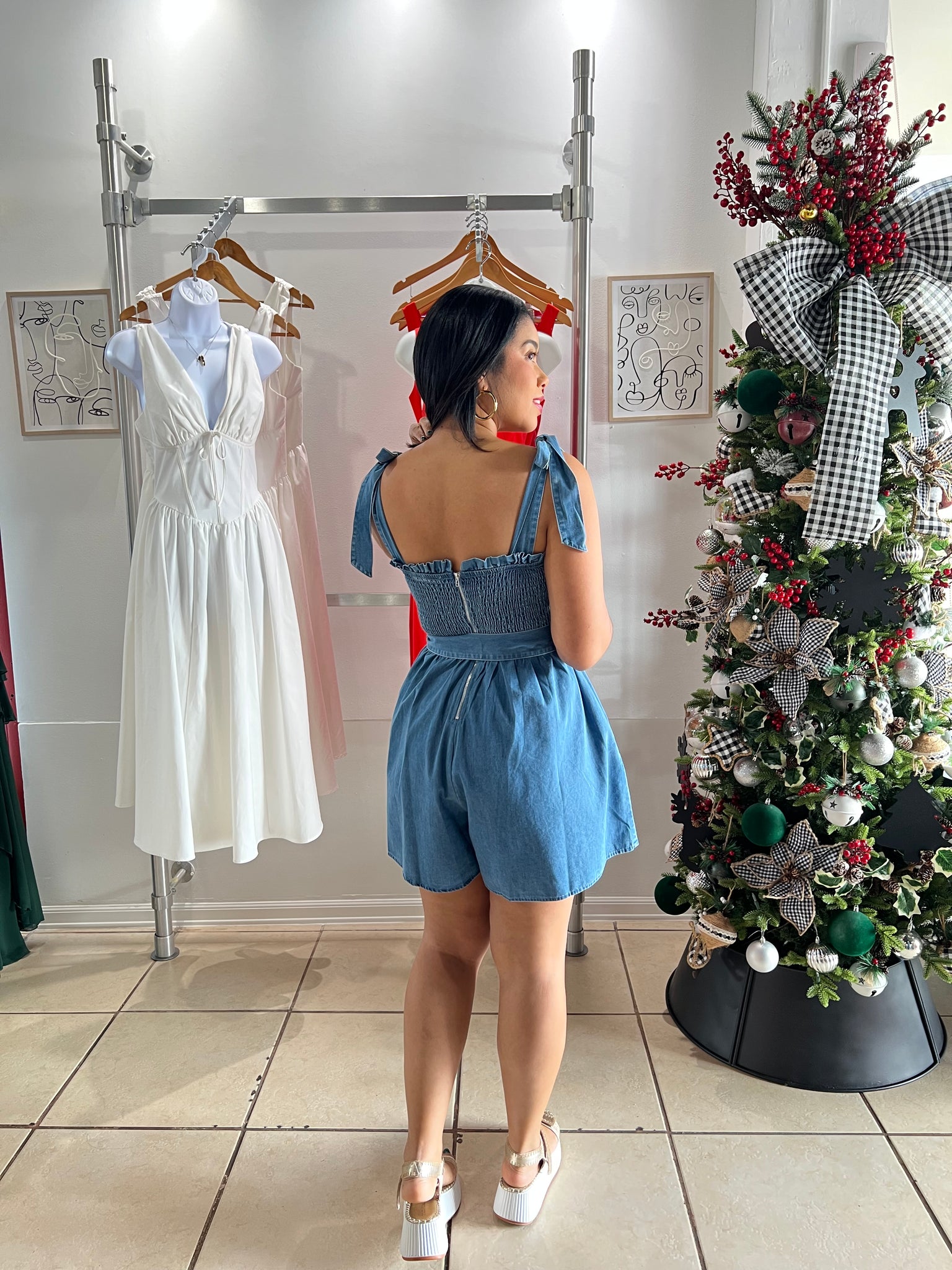 Sky blue cambray tie shoulder straps romper, back zipper, pockets
